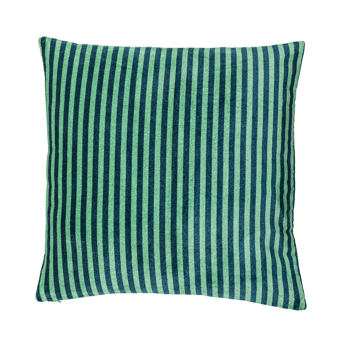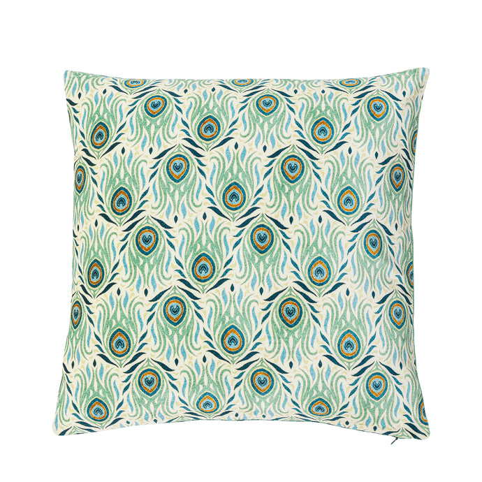 The Adia Cushion by Creative Collection is made of cotton with polyester filling and has a soft surface with a velor look. The front is adorned with a graphic peacock pattern in shades of green, while the back has fine stripes in the same color scheme.
