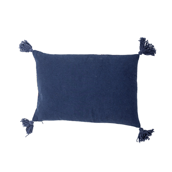 The Adya Cushion by Creative Collection features a rich, detailed pattern in deep blue, green, and golden tones. The design depicts peacocks and flowers in a symmetrical layout, and each corner is finished with a dark blue tassel that adds a decorative touch.